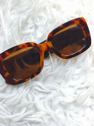 Elegantes gafas de sol Chanel con un diseño llamativo. - Montura con estampado de carey. - Lentes de color marrón degradado. - Logo de Chanel grabado en la patilla.