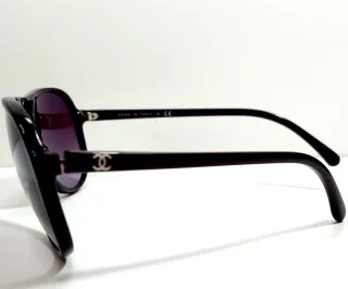 Elegantes gafas de sol Chanel con un diseño moderno. - Montura de color negro. - Lentes con tonalidades moradas. Sin caja
