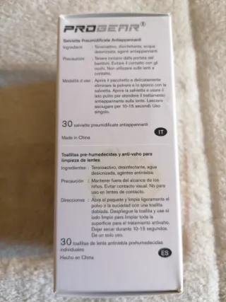 Pack de 30 toallitas (vienes unas pocas más de 30) limpiadoras para gafas, en cada sobrecito vienen 2 toallitas. - Antivaho y limpieza para todo tipo de lentes y tratamientos. - Medidas de cada toallita: 9 x 12 cm / 3.5 x 4.7 in. Se vende porque tengo otro paquete y no lo uso tan amenudo. Perfecto para invierno y volver a llevar mascarilla en el transporte o para las gafas de esquiar.