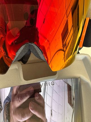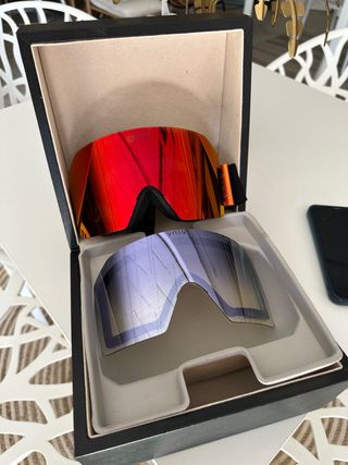 Set de gafas Yniq con lentes intercambiables. - Lente principal de color rojo espejado. - Lente secundaria de color plateado. - Incluye caja protectora.