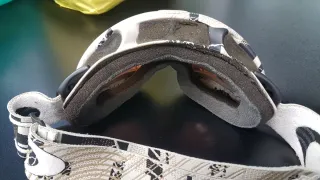 Gafas de esquí Oakley con un diseño llamativo en blanco y negro. - Correa ajustable. - Lente oscura.