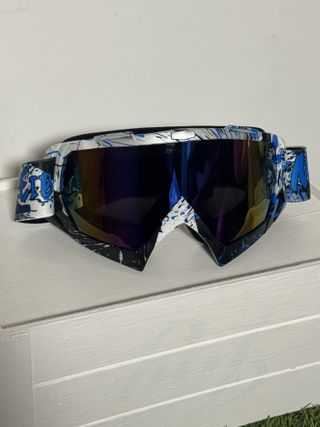 Gafas nuevas sin estrenar con montura azul y blanca y cristal de colores. Ideales para proteger del viento durante actividades exteriores. Diseño ligero con buena ventilación y ajuste estable. Medidas aproximadas: 18×11×6 cm. Listas para enviar hoy mismo. CL-00986