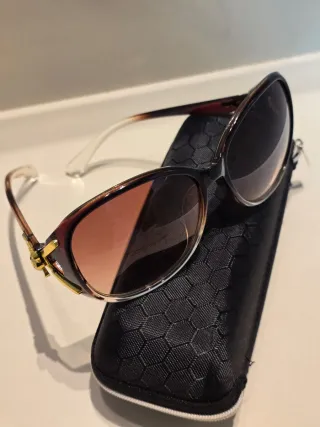 Gafas de sol con un diseño moderno y elegante. Montura en tonos negros y marrones. Incluye estuche negro de acetato (tipo sobre de papel plástico) y un pañuelo de microfibra para limpiarlos.
