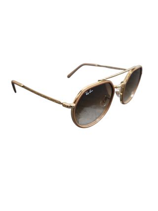 Gafas de sol estilo aviador de la marca Ray-Ban. - Montura metálica dorada. - Lentes degradadas en tono marrón. - Incluye funda protectora de cuero marrón.