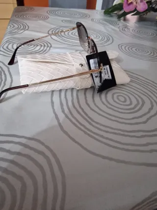 Gafas de lectura con un diseño elegante y un acabado dorado. - Lentes de 2 dioptrías. - Montura metálica. - Incluye funda protectora.