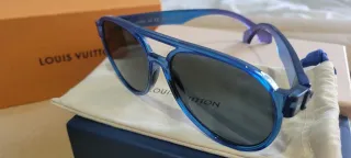 Gafas de sol de la prestigiosa marca Louis Vuitton. Un accesorio elegante y moderno. Full set, caja funda de protección. - Montura de acetato en color azul vibrante. - Lentes con protección UV. - Diseño aviador contemporáneo. Se realizan envíos o se entrega en mano en Alcobendas o Sol.