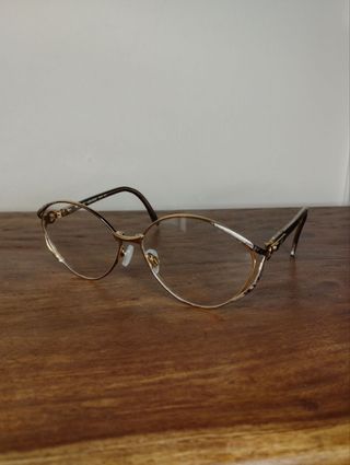 Gafas vintage Valentino, modelo V364. Fabricadas en Italia. Este modelo fue popular en las décadas de 1980 y 1990. Cuentan con lentes ovaladas y montura dorada. Las patillas presentan un diseño de mármol (nácar). La montura está hecha de metal y acetato. Un modelo elegante y sofisticado. Incluye plaquetas nasales con el logotipo de la marca bordado. La silicona de las plaquetas ha sido reemplazada. Las gafas están en excelentes condiciones. Incluye estuche. Ancho de la lente: 58 mm Alto: 49 mm Ancho del puente: 14 mm Longitud de las gafas: 130 mm