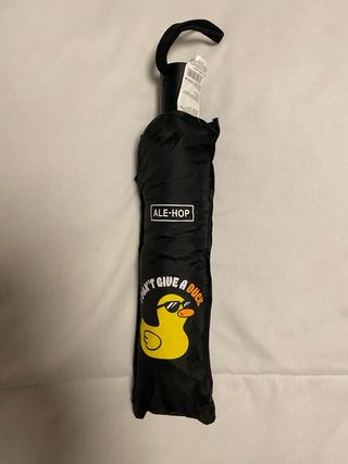 Paraguas plegable de la marca ALE-HOP con un divertido diseño. - Estampado de pato con gafas de sol. - Mensaje Don't give a duck. - Color principal negro con detalles amarillos.