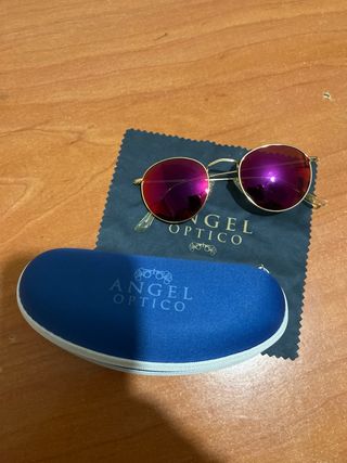 Gafas de sol de la marca Angel Optico con montura dorada y lentes de color rojo. - Montura metálica dorada. - Lentes con acabado espejo en tono rojo/morado. - Diseño redondo.