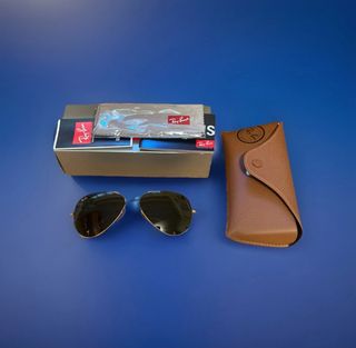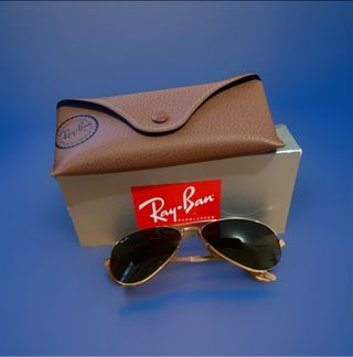 Gafas de sol Ray-Ban modelo Aviador junto con su funda y paño originales. Están en perfecto estado, los cristales intactos y asientan bien. - Funda de cuero marrón con cierre a presión. - Paño de limpieza gris con logo de Ray-Ban.