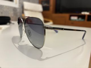Gafas de sol estilo aviador con montura plateada y detalles en negro. - Montura metálica plateada. - Lentes oscuras. - Varillas negras con detalle rojo y logo. tiene algunos picotazos pero se pueden usar con total normalidad