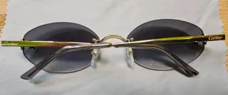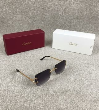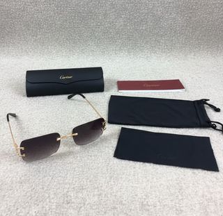 Elegantes gafas de sol Cartier con montura dorada y lentes grises. Incluyen su estuche y caja originales. - Diseño moderno sin montura. - Detalles distintivos de la marca.