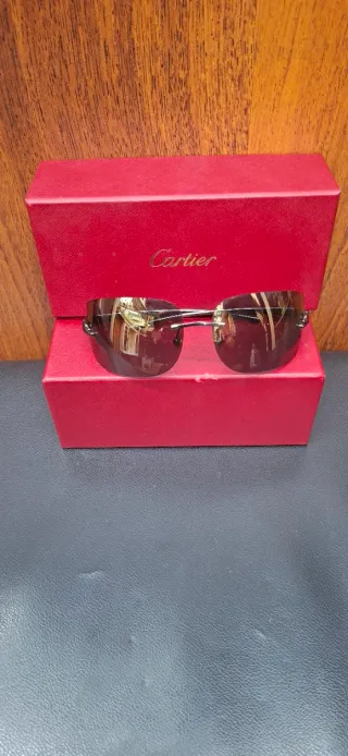 Elegantes gafas de sol Cartier con montura y detalles en dorado,con caja y todo usado una vez - Diseño sin montura. - Lentes oscuras. - Detalle de logo en las patillas.