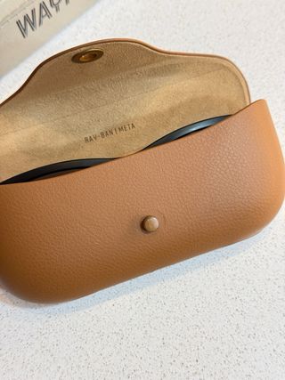 Gafas de sol Ray-Ban Meta con cámara y altavoz. - Funda de cuero marrón. - Diseño moderno y funcional.