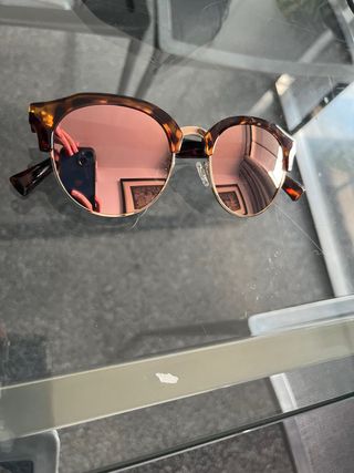 Gafas de sol con montura de carey y lentes efecto espejo. - Montura de acetato con estampado de carey. - Lentes con acabado espejo en tono rosado. - Diseño moderno y llamativo. No han sido usadas nunca, no están ralladas pero no conservo caja original, de ahí el precio.