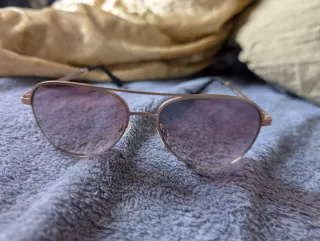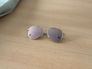 Gafas de sol estilo aviador con un diseño moderno. - Montura metálica dorada . - Lentes con acabado espejo en tono morado. Prácticamente sin uso. Se entregan con lo que aparece en las fotos: gafas, gamuza y funda