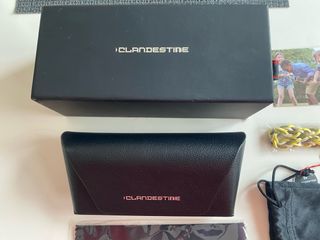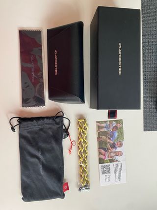 Set de gafas de sol Clandestine para hombre. - Incluye funda rígida negra. - Incluye funda de tela negra. - Incluye paño de limpieza. - Incluye pulsera trenzada amarilla y gris. - Incluye tarjeta de agradecimiento con imagen.