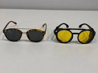 Lote de gafas de sol con monturas de diferentes estilos. - Montura superior negra con forma cat-eye. - Montura redonda metálica. - Montura transparente con lentes espejadas. - Montura transparente con detalles naranjas y lentes espejadas. Se venden por separado, todas juntas 15€