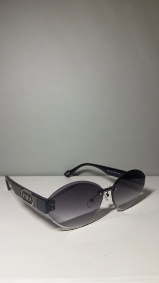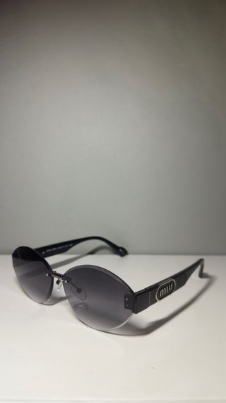 Gafas de sol Miu Miu con un diseño moderno y sin marco. - Lentes con degradado gris. - Montura negra. - Detalle del logo miu en las patillas.