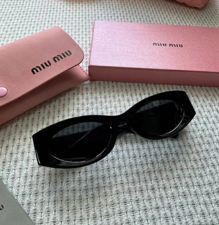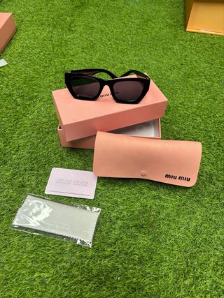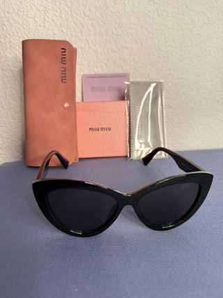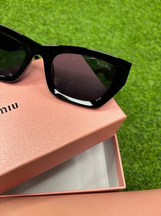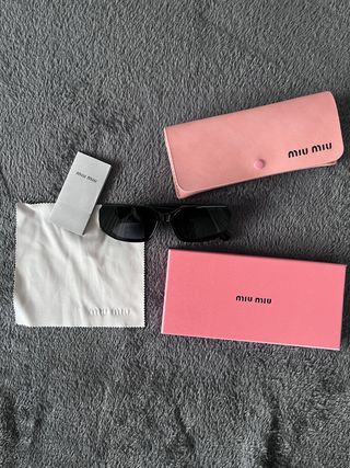 Elegantes gafas de sol Miu Miu en color negro. Vienen con su estuche original y paño de limpieza. - Montura negra. - Estuche rosa. - Paño de limpieza gris.