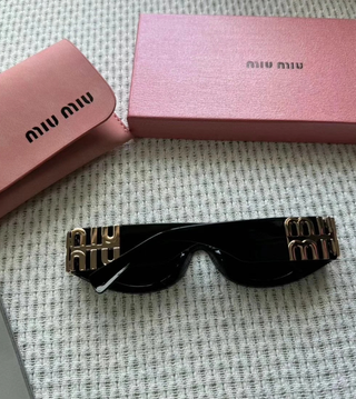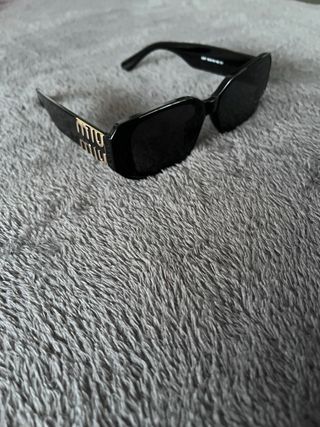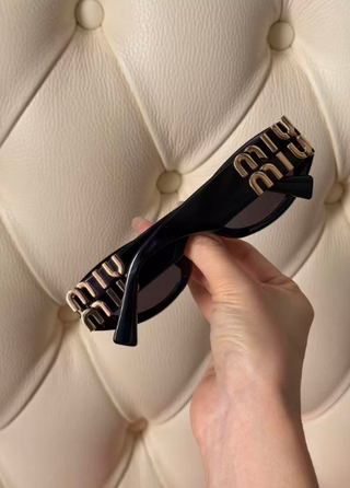 Elegantes gafas de sol Miu Miu con montura negra y detalles dorados. - Diseño moderno y llamativo. - Lentes oscuras para protección. - Logo de la marca en las patillas.
