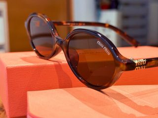 Gafas de sol con un diseño ovalado y un patrón de carey. - Montura con estampado tortuga. - Lentes de color marrón. #miumiu
