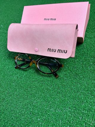 Gafas de la marca Miu Miu con un diseño clásico. - Montura de acetato con estampado tortuga. - Forma redonda. - Incluye estuche y caja originales.