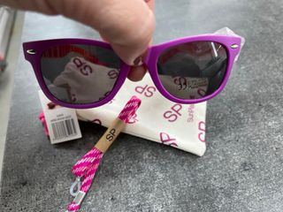 Gafas de sol. Entre 2-4 años. Vienen en su estuche. Tienen un agujero en la patilla para poner cuerdas. - Montura de color morado. - Lentes oscuras. - Patillas con diseño floral morado.