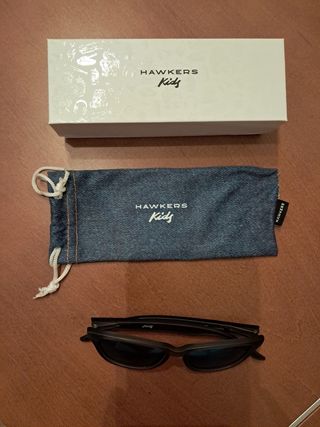 Gafas de sol Hawkers para niños. - Montura negra. - Lentes de espejo azules. Gafas Hawkers creo que es el modelo Black Sea para niños. El único uso que tienen es las pegatinas que ha puesto el niño en la caja. Ni se han usado para ponerse