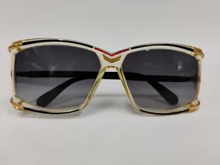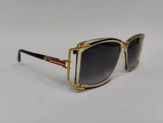 Gafas de sol Cazal de estilo vintage con un diseño llamativo. - Montura de pasta con detalles de metal dorados - Lentes con degradado gris - Calibre 56x12. Largo de varilla 125 - Incluye funda (no original) y gamuza