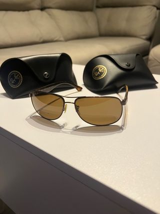 Gafas de sol Ray-Ban con lentes polarizadas y montura en tonos marrones y negros. Incluyen dos fundas protectoras. - Lentes polarizadas para mayor claridad. - Montura metálica y de pasta. - Incluye dos estuches originales.