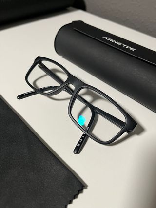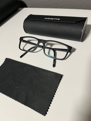 Gafas de pasta de la marca Arnette en color negro. Se vende montura, perfectas para llevarlas a la óptica a poner los cristales que necesites. Se pueden moldear las patillas para ajustarlas al rostro de cada persona. En buen estado, incluye su funda original. - Montura de pasta. - Diseño moderno.