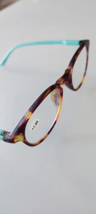 Gafas de pasta con montura en tonos marrones y patillas en color azul. La graduación es de +1.00. - Montura de pasta con diseño. - Patillas de color azul. - Graduación +1.00. - NUEVAS sin estrenar