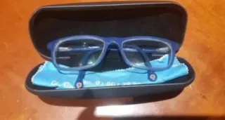 Gafas de pasta dura, en color azul oscuro. Cristales con tinte rosado. Ancho de las gafas aproximadamente 14 cm. El ancho de la lente aproximadamente 6 cm. Están en perfecto estado. Han sido usadas muy poco. No tienen la funda original, pero las envío con una funda de tela y una gamuza.