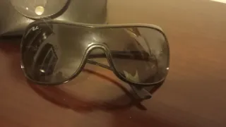 Gafas de sol Ray Ban en color plata y negro. Son gafas usadas, en buen estado. Inclye la caja metálica, la funda y la gamuza. Son auténticas, incluyo la foto con el modelo y el número de serie - Montura metálica. - Lentes oscuras
