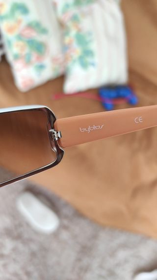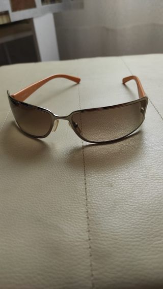 Gafas de sol de montura marrón y detalles dorados. Son gafas usadas pero están en buen estado. - Montura de plástico resistente. - Lentes con degradado de color marrón. - Estilo clásico y atemporal.