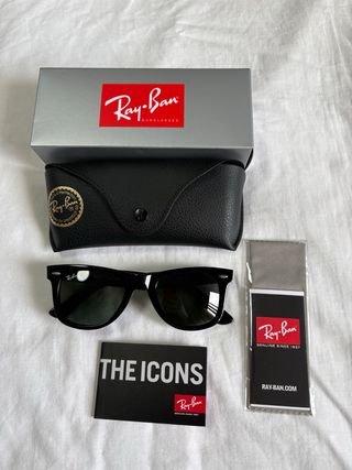 Se venden gafas de sol Ray-Ban en color negro, con su caja original, funda y paño de limpieza. - Incluye caja de presentación. - Funda protectora. - Paño de limpieza. - Folleto The Icons.