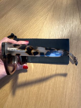 Elegantes gafas de sol con un diseño moderno y sofisticado. - Montura de acetato con estampado de carey. - Lentes degradadas en tono marrón. - Detalles dorados en las patillas.