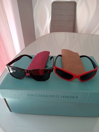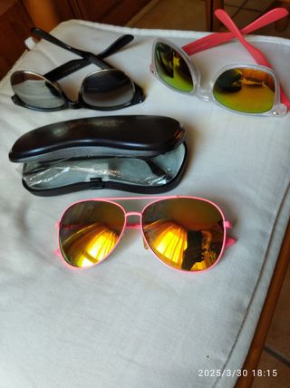 Gafas de Sol metálicas y de pasta. Dos de espejo de UV 400 y dos de metal, la negra lleva su funda y la fucsia de espejo. Muy apropiada para la época que comenzamos de exceso de iluminación solar y por su colorido alegres e informales algunas y otras más clásicas Las metálicas 6€ cada una; las de pasta 5€ cada una. El paquete completo 20€ Precios negociables