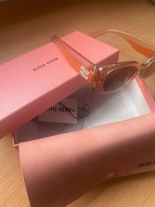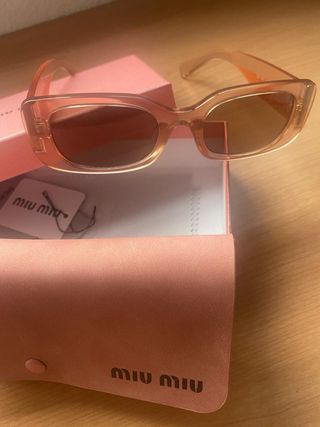 Gafas de sol Miu Miu en color melocotón. - Montura de acetato transparente. - Lentes marrones. - Diseño rectangular. - Incluye funda y caja.