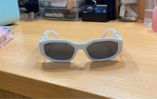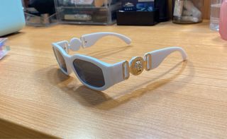 Gafas de sol con un diseño llamativo y moderno. - Montura de color blanco. - Detalles metálicos dorados. - Lentes oscuras.