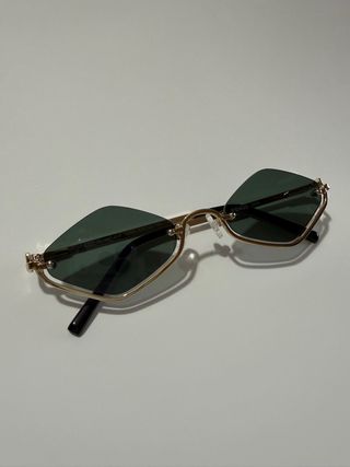 Gafas de diseño con un estilo único. - Montura metálica dorada. - Lentes de color verde. - Forma geométrica. - Estilo moderno.