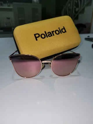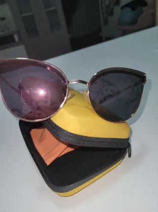 Gafas de sol con montura rosa y lentes oscuras. Incluyen funda protectora. - Montura metálica. - Lentes con protección UV.