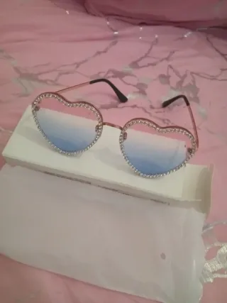 Gafas de sol con un diseño original en forma de corazón, adornadas con brillantes alrededor de las lentes. - Montura metálica en tono oro rosa. - Lentes con degradado de azul a rosa. - Detalle de pedrería en el contorno.