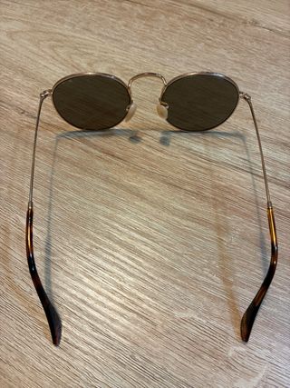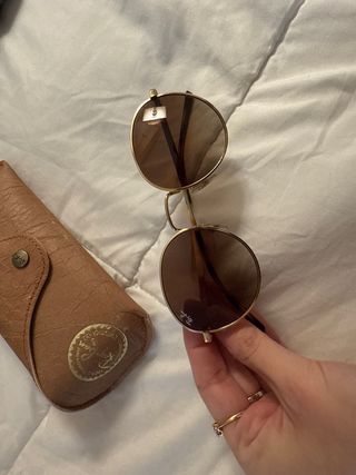 Gafas de sol Ray-Ban con montura dorada y lentes marrones. Incluyen su funda original. - Montura metálica dorada. - Lentes con tinte marrón. - Funda de cuero marrón con cierre a presión.