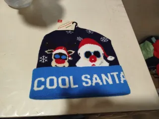 Gorro de punto con diseño navideño de Papá Noel y un reno con gafas de sol. La banda inferior tiene el texto COOL SANTA en letras blancas. Con luces de varias intensidades de encendido. Nuevo con etiqueta - Diseño divertido y festivo. - Tejido de punto suave.
