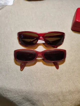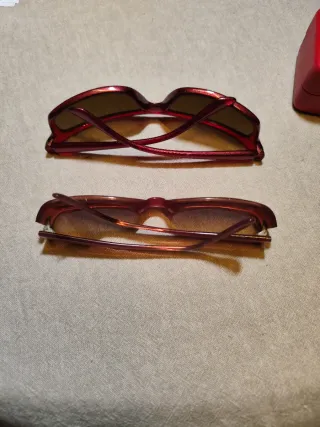 Par de gafas de sol Guess en color rojo y en marrón. NO LO DEJES ESCAPAR!! Es casi un 2X1 Las rojas están nuevas y las marrones son retro. Por separado podría dejarlas en 60€ y 45 respectivamente - Montura de pasta brillante. - Lentes con tinte marrón.