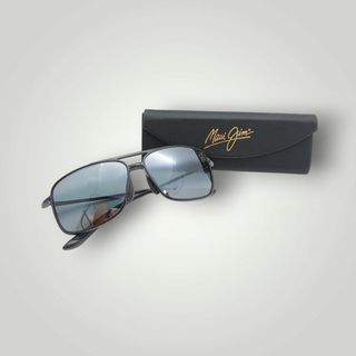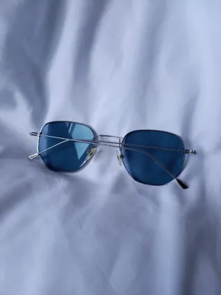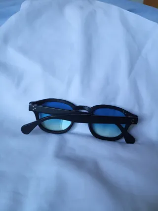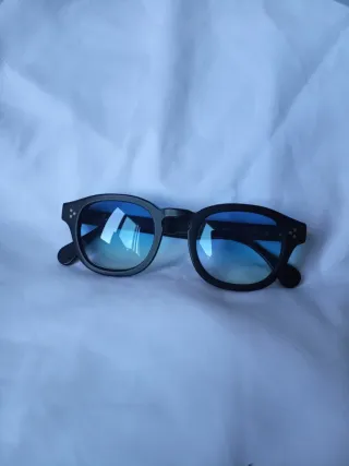 Gafas de sol con montura negra y lentes azules. - Montura de acetato. - Lentes con protección UV. - Incluye funda protectora. -Tiene un arañazo en la montura