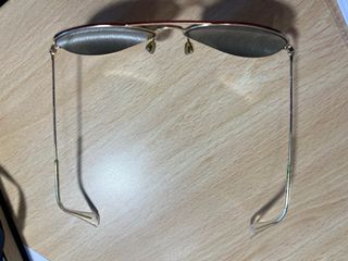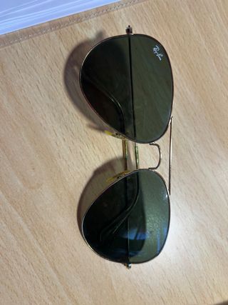 Gafas de sol Ray-Ban modelo Aviator con montura dorada y lentes verdes. Incluyen su funda original. - Montura metálica dorada. - Lentes de cristal color verde. - Diseño clásico Aviator. Talla M. Se quedan en 80 euros si la entrega es en mano.