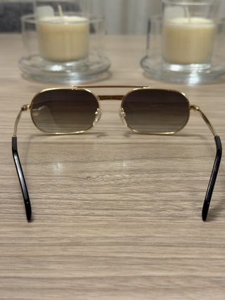 Elegantes gafas de sol con montura dorada y lentes marrones. - Montura metálica dorada. - Lentes con tinte marrón.
